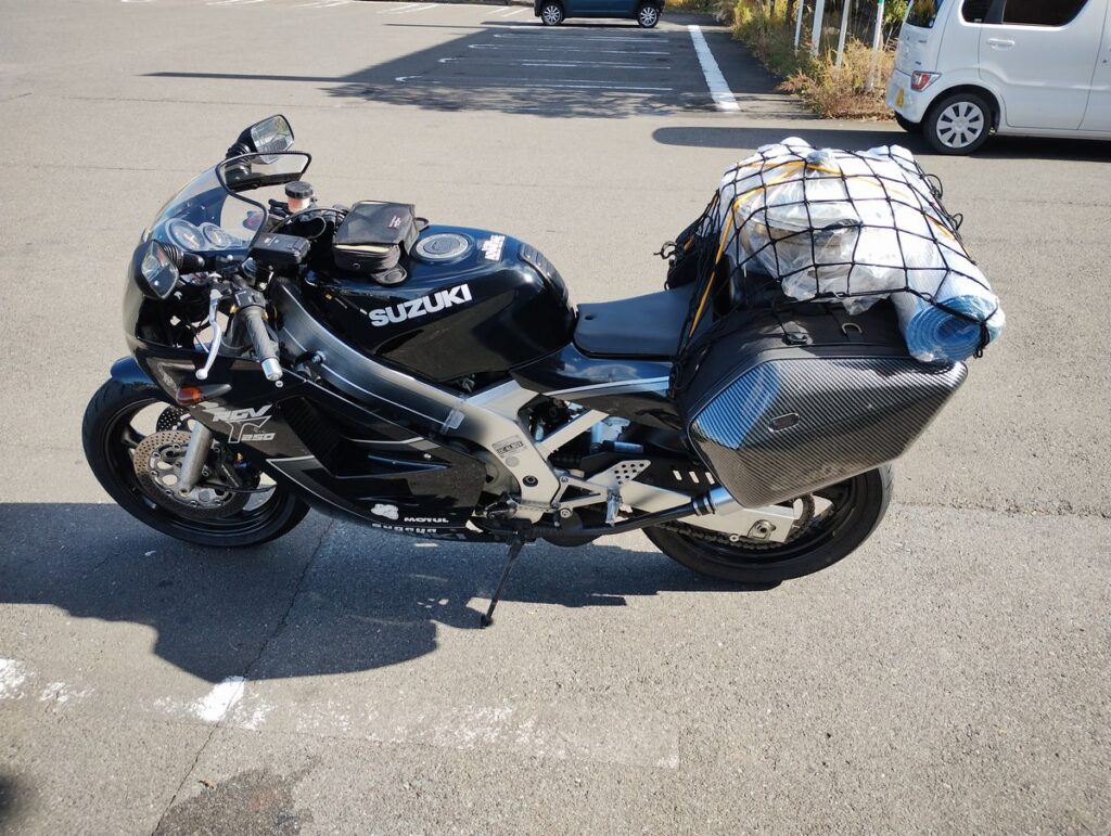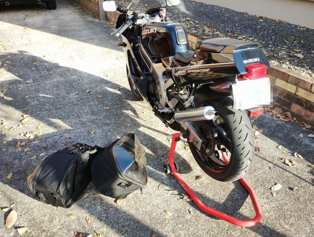 朝食もそこそこに、ガレージからガンマとサイドバッグを引っ張り出しました。