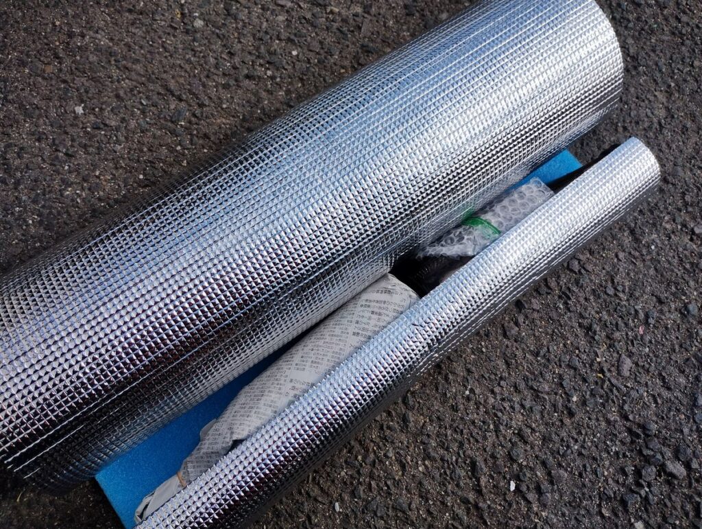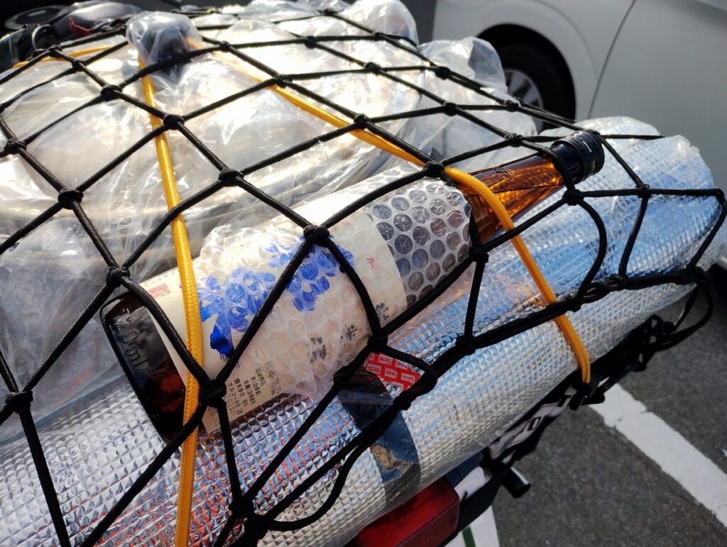 ゲットした四合瓶2本は、キャンプ用の銀マットに包みます。