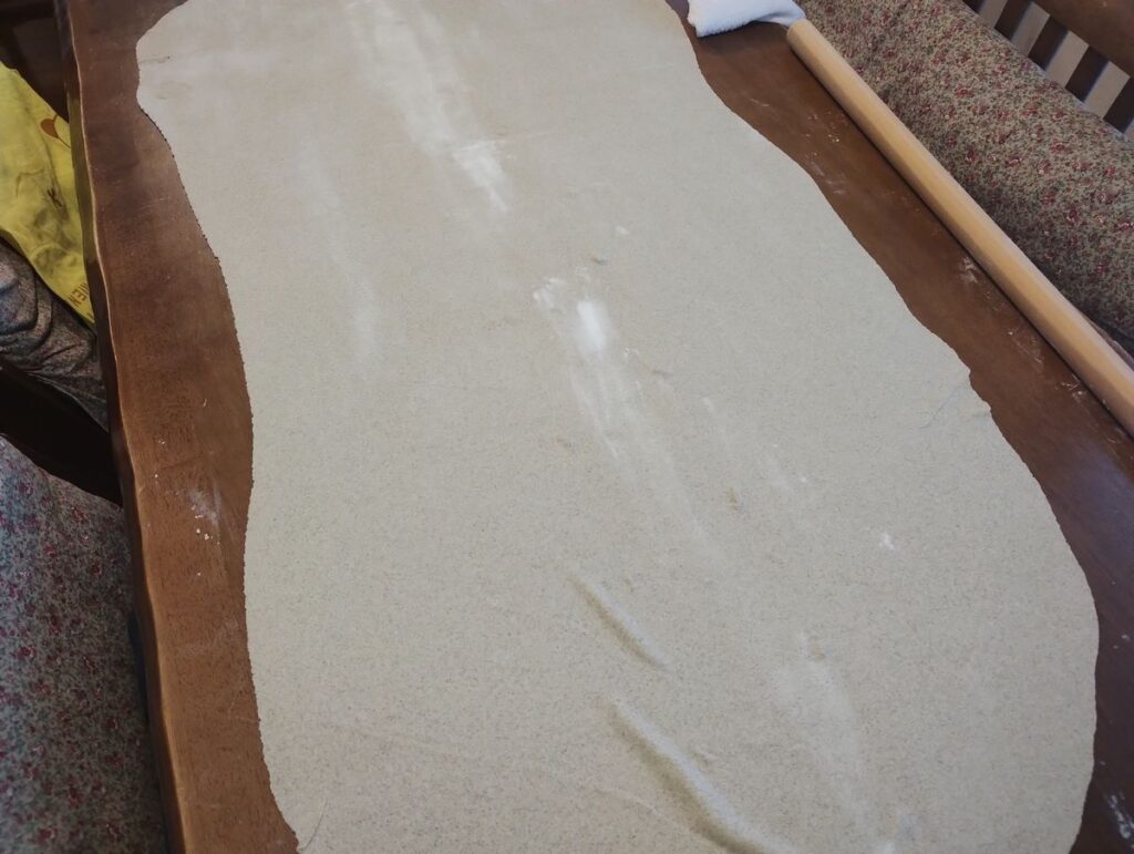 今回も、のし台ははダイニングテーブル、サクサクと蕎麦粉をコネて伸ばします。