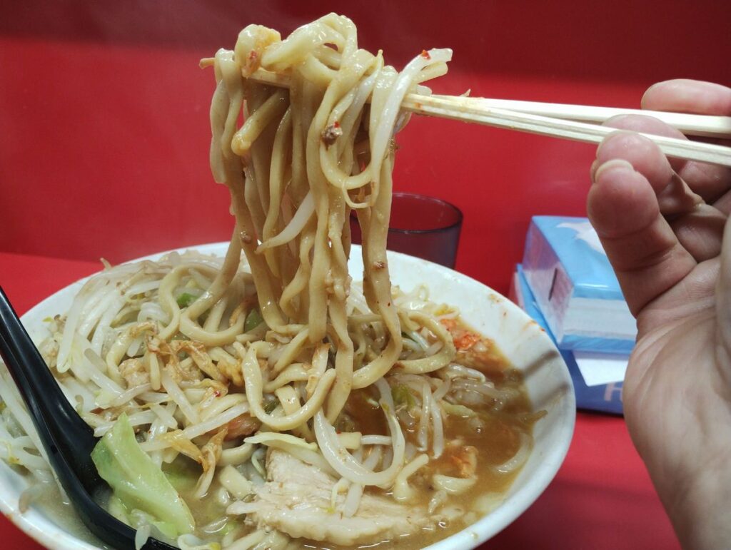 この、小麦粉の旨さが凝縮されている極太麺が、ラーメン二郎の最大の魅力ですね。