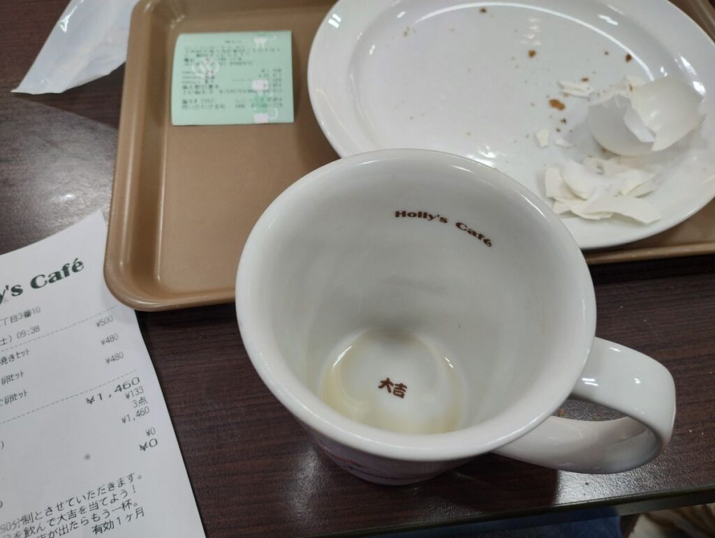 この日のモーニングはHolly’s cafe、カップの底から大吉が出て、コーヒー無料おかわりです。