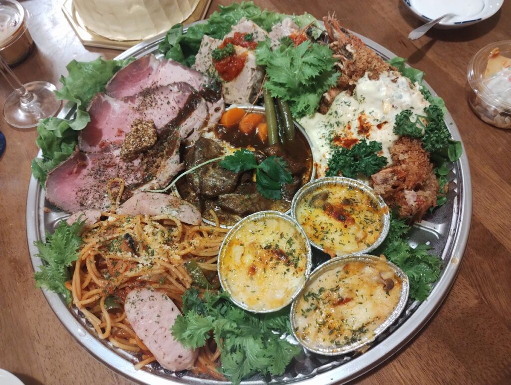 ローストビーフにエビフライにビーフシチュー、パスタ、牡蠣グラタン。